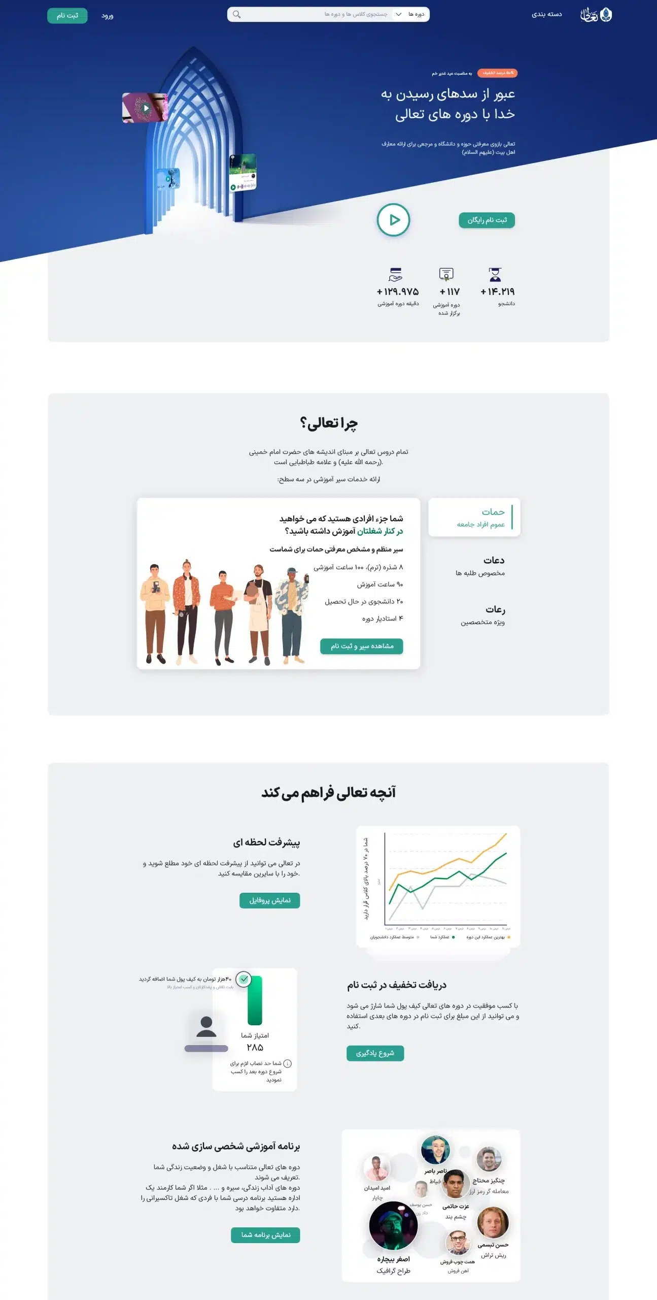اولین چیزی که در ورود به سایت دیده می شود محرابی در تصویری گسترده است که به سوی نور گشوده شده؛ عکس و عنوان تعدادی از دوره ها بر روی ستون های آن نمایش داده شده و این به این معناست که شرکت در این دوره ها شما را به نور هدایت می کند.